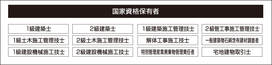 土木部門の創設以来、わたしたちは多様な現場でノウハウを積み上げてきました。解体と開発の両方を手がける当社だからこそ、成しえる仕事があります。保有する建設機械は高い充実度を誇り、経験豊富なオペレーターや管理実績を積んだ国家資格保有者の在籍など、皆さまの事業や大切な資産を安心してお任せいただける体制を整えております。