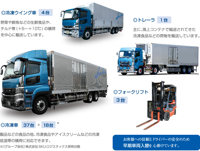 ほとんどが冷凍機装着車で、常温~マイナス30℃までの幅広い温度帯の荷物に対応しています。冷凍機チャートの使用により温度管理が万全です。